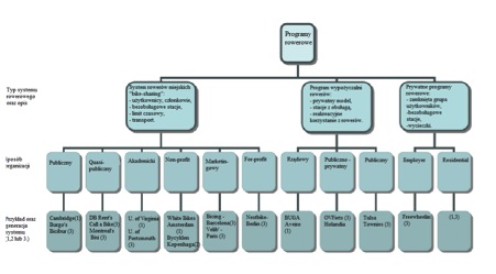 Publiczny model opiera się na takich samych zasadach jak przedsiębiorstwa komunikacji publicznej. Niekiedy powołuje do życia systemy rowerowe, które straciły już swoje istnienie. Przykładem takiego miasta może być Cambridge (Green Bike program), który jest systemem opartym na zasadzie użytkowania rowerów pierwszej fazy ewolucji. Model quasi-publiczny operowany jest przez przedsiębiorstwa transportowe regionalne lub narodowe, przykładem może być przedsiębiorstwo Deutsche Bahn, które odpowiedzialne jest za państwowe koleje w Niemczech i również udostępnia usługi wypożyczania rowerów. Model akademicki umożliwia wypożyczanie rowerów na ternie kampusów uniwersyteckich. Umożliwia w prosty i szybki sposób przemieszczanie się pomiędzy wydziałami. Modelem non-profit operują organizacje, które wyraźnie zostały utworzone do udzielania usług w zakresie wypożyczania rowerów. Przykładem może być system rowerowy w Kopenhadze. Model marketingowy wykorzystuje przestrzeń publiczną, rowery, wielkoformatowe reklamy oraz wiaty aby generowały dochody z zamieszczania na nich reklam. Model ten jest efektywnym sposobem dla lokalnych struktur administracyjnych, które nie mogą pozwolić sobie na utworzenie systemu rowerów w żaden inny sposób [DeMaio 2009]. Model nastawiony na zysk (for profit) operowany jest przez prywatne przedsiębiorstwa, na które wpływ lokalnych czy wyższych władz jest niemożliwy lub ograniczony [DeMaio 2009]. Przykładem takiego modelu może być przedsiębiorstwo Nextbike działająca w Niemczech, Austrii, Szwajcarii, Łotwie, Polsce, Nowej Zelandii i Turcji. 3.2 Metodyka tworzenia wskaźników lokalizacji nowych stacji w mieście.