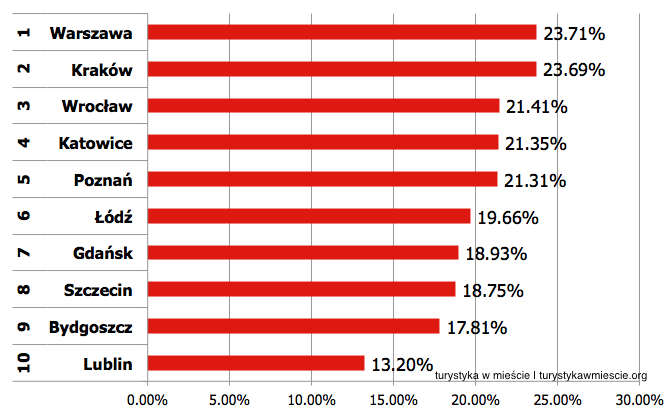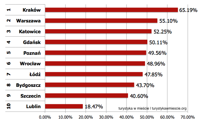 - Najbardziej umiędzynarodowioną (prawie w jednej czwartej) gospodarkę turystyczną posiadają Warszawa i Kraków. Oba miasta znalazły się na czele także w dwóch poprzednich rankingach, co potwierdza ich dominującą pozycję;