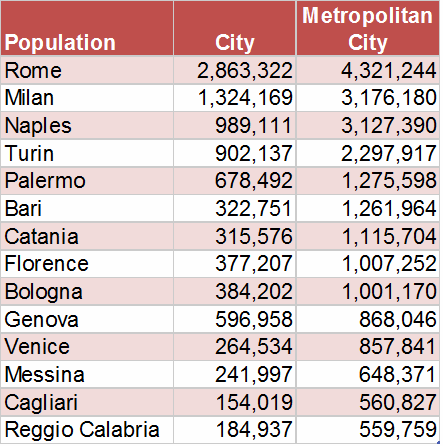 Rozpiętość wielkościowa nowych obszarów jest duża. Największymi metropoliami będą ponadczteromilionowy Rzym oraz trzymilionowe Mediolan i Neapol, najmniejszymi półmilionowe Cagliari i Calabria. Na mocy ustawy metropolitalnej, uchwalonej już w marcu tego roku, administracyjnie metropolie zastąpią prowincje (odpowiedniki naszych powiatów), których rola na pozostałych obszarach także będzie zmniejszona.