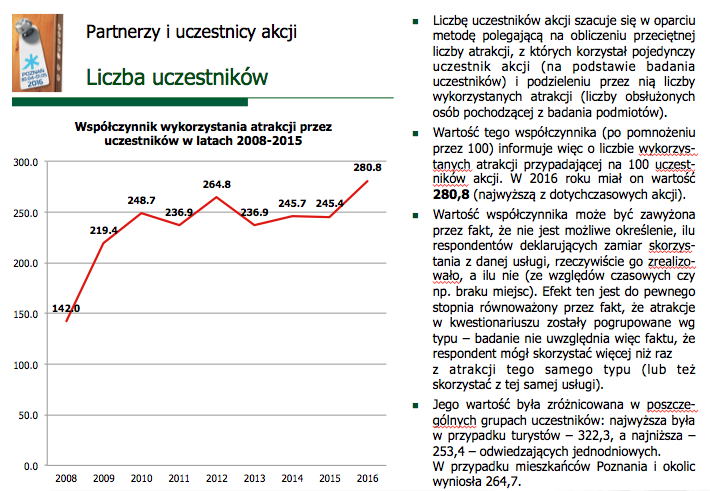 Liczbę uczestników akcji szacuje się w oparciu metodę polegającą na obliczeniu przeciętnej liczby atrakcji, z których korzystał pojedynczy uczestnik akcji (na podstawie badania uczestników) i podzieleniu przez nią liczby wykorzystanych atrakcji (liczby obsłużonych osób pochodzącej z badania podmiotów). Wartość tego współczynnika (po pomnożeniu przez 100) informuje więc o liczbie wykorzystanych atrakcji przypadającej na 100 uczestników akcji. W 2016 roku miał on wartość 280,8 (najwyższą z dotychczasowych akcji).
