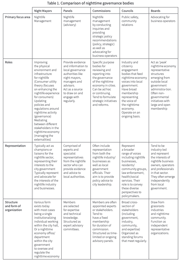 The rise of night mayors and other nighttime governance bodies represents an emerging model of urban governance. Vibrant nightlife scenes have become central to the identity and economy of global cities. However, the complex needs of nightlife stakeholders pose unique governance challenges. In response, some cities have instituted specialized offices of night mayor to oversee nighttime economic policy. This goal of this article is to examine this solution as a unique governance approach and compare the roles of night mayors to other nighttime consultative bodies like councils, commissions, panels, and boards. Taking into account all kinds of utility derived from nighttime activities, externalities, and stakeholders needs, the author differentiates night mayors’ concentrated leadership from the broader representation of advisory panels. It turns out that night mayors provide centralized oversight, while councils offer grassroots expertise. By working together they can create holistic strategies tailored to nighttime economies.